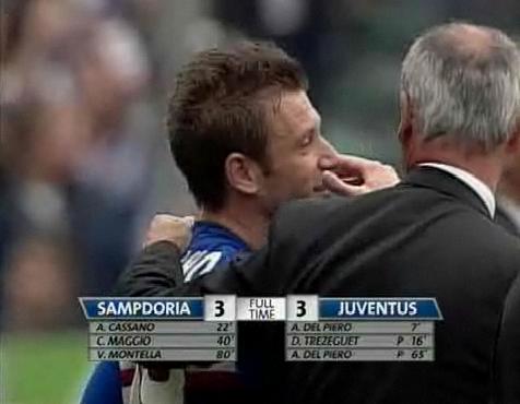 Remek mrkzssel fejezte be a Serie A 2007/08-as kirst a Juventus, miutn 3-3-as dntetlent rt el a Sampdoria otthonban. A glgyrts mr a mrkzs elejn elkezddtt, amikor Nedved pomps labdjt Del Piero gurtotta Mirante kapujba. Nhny perccel ksbb a Capitano kiharcolt egy tizenegyest, s rgsnak jogt a glkirlyi vetlytrs David Trezeguetnek engedte t, aki nem hibzott, gy 20-20 gllal kzsen vezettk a gllvlistt. Ezek utn Zebint is felvgtk a 16-oson bell, m a jtkvezet spja nma maradt. A flid msodik rszben azonban mr Antonio Cassano volt a fszerepl: elbb egy gynyr szl utn ltt a Buffont helyettest hljba (lvse egy Juve-vdn pattant meg), majd a jtkrsz utols percben bntett is rghatott, m azt a cserekapus kivdte. A kett kztt pedig Maggio ltt hatalmas glt. A msodik flidben Del Piero kiharcolt egy jabb bntett, amit mr jmaga rtkestett. Ezek utn Sissokt msodik srga lapja utn killtottk, s egy jabb Cassano-szl utn Montella alaktotta ki a 3-3-as vgeredmnyt. Miutn Del Piert lecserlte Ranieri mester, mrkzs alatt kistlt a Juve kanyarja al ksznteni a szurkolkat, s ment egy krt a teljes stadionban, s a Sampdoria szurkolitl is hatalmas tapsot kapott. Kiemelked teljestmnyt nyjtott a kapitnyon kvl Jonathan Zebina sPavel Nedved. A mrkzs vgn Antonio Cassano s Claudio Ranieri sszelelkezve vonultak le a plyrl, a fiatal csatr szjt eltakarva magyarzott hevesen a rmai szlets mesternek...